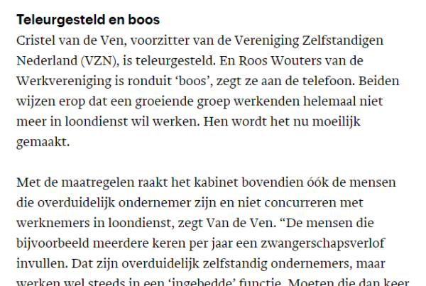 Kabinet koerst richting loondienst. Cristel van de Ven in Trouw