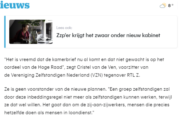 Met de nieuwe ZZP-plannen van het kabinet wordt eerder onduidelijkheid geschapen, vindt VZN-voorzitter Cristel van…